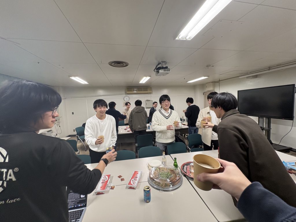 卒業論文・修士論文・博士論文の提出および発表という大きな節目を迎えた皆さんの労をねぎらい、研究室にて打ち上げを開催しました。研究を通して積み重ねてきた努力やエピソードを振り返りながら、普段とは少し違う和やかな雰囲気の中で交流を深めるひとときとなりました。また、来年度から新たに研究室に加わるメンバーも参加し、終始和やかな会となりました。いい話です。